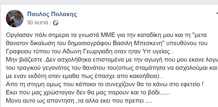 Με ανάρτησή του στο Facebook ο Παύλος Πολάκης σχολίασε την απόφαση του Πολυμελές Πρωτοδικείου Αθηνών, που τον έκρινε ένοχο για εξύβριση και του επέβαλε χρηματική αποζημίωση στην οικογένεια του αδικοχαμένου δημοσιογράφου Βασίλη Μπεσκένη.