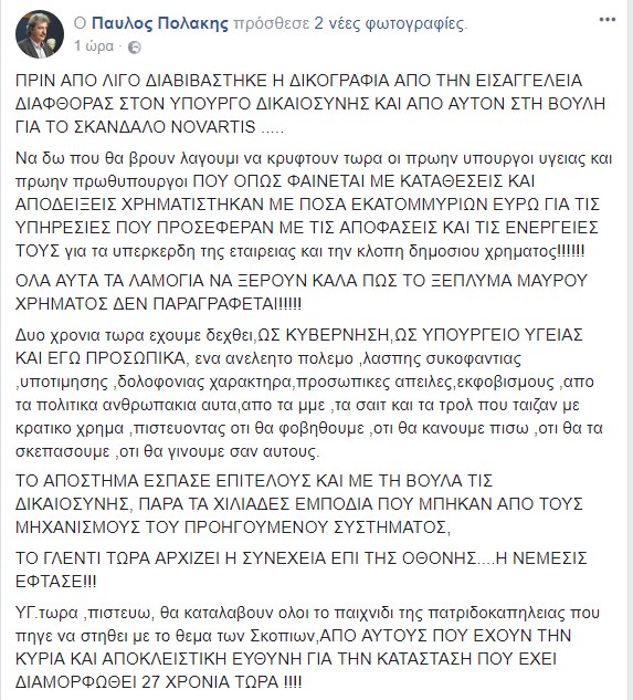 Νέα αιχμηρή ανάρτηση από τον Παύλο Πολάκη στο Facebook, αυτή τη φορά αναφορικά με τις εξελίξεις στην υπόθεση Novartis.”Να δω που θα βρουν λαγούμι να κρυφτούν τώρα οι πρώην υπουργοί υγείας και πρώην πρωθυπουργοί που όπως φαίνεται με καταθέσεις και αποδείξεις χρηματίστηκαν με ποσά εκατομμυρίων ευρώ για τις υπηρεσίες που προσέφεραν με τις αποφάσεις και τις ενέργειες τους για τα υπερκέρδη της εταιρείας και την κλοπή δημοσίου χρήματος.
