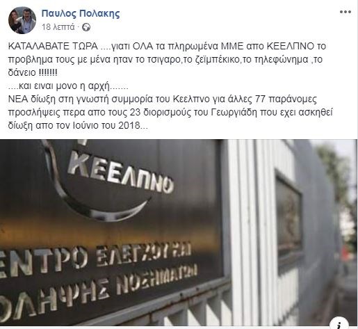 Με τον δικό του τρόπο σχολίασε ο αναπληρωτής υπουργός Υγείας Παύλος Πολάκης τις ποινικές διώξεις σε βάρος πέντε προσώπων που ασκήθηκαν από την Εισαγγελία Διαφθοράς για παράνομες προσλήψεις στο ΚΕΕΛΠΝΟ την περίοδο 2011-2014.Ο κ. Πολάκης έγραψε ότι «είναι μόνο η αρχή» και μεταξύ άλλων ανέφερε: «καταλάβατε τώρα γιατί όλα τα πληρωμένα ΜΜΕ από ΚΕΕΛΠΝΟ το πρόβλημά τους με εμένα ήταν το τσιγάρο, το ζεϊμπέικο, το τηλεφώνημα, το δάνειο». Αναλυτικά όσα έγραψε στο Facebook