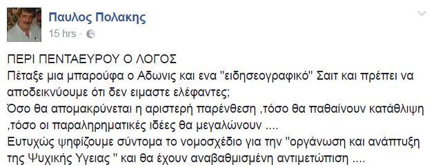 Ευτυχώς ψηφίζουμε σύντομα το νομοσχέδιο για την “οργάνωση και ανάπτυξη της Ψυχικής Υγείας ” και θα έχουν αναβαθμισμένη αντιμετώπιση…” έγραψε ο κ. Πολάκης.