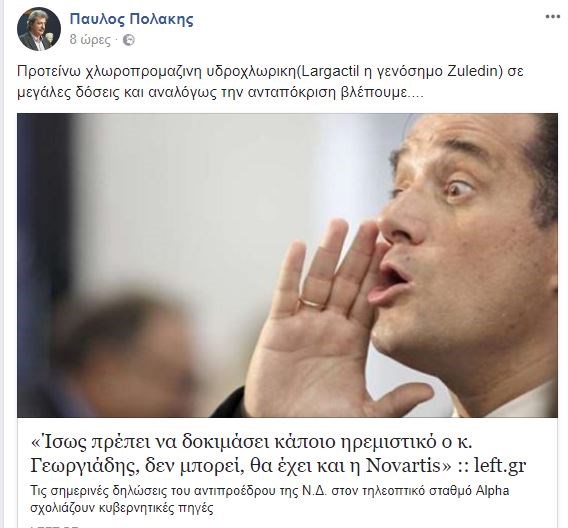 «Προτείνω χλωροπρομαζίνη υδροχλωρική(Largactil η γενόσημο Zuledin) σε μεγάλες δόσεις και αναλόγως την ανταπόκριση βλέπουμε….» γράφει ο κ. Πολάκης στο Facebook .Η χλωροπρομαζίνη υδροχλωρική χρησιμοποιείται στην αντιμετώπιση ψυχωσικών καταστάσεων ιδιαίτερα όταν συνοδεύονται από ψυχοκινητική διέγερση.Σημειώνεται ότι χθες κυβερνητικές πηγές, σχολιάζοντας τις δηλώσεις του κ. Γεωργιάδη κατά του Πρωθυπουργού, σχολίαζαν σκωπτικά: «Ίσως πρέπει να δοκιμάσει κάποιο ηρεμιστικό, δεν μπορεί, θα έχει και η Novartis»