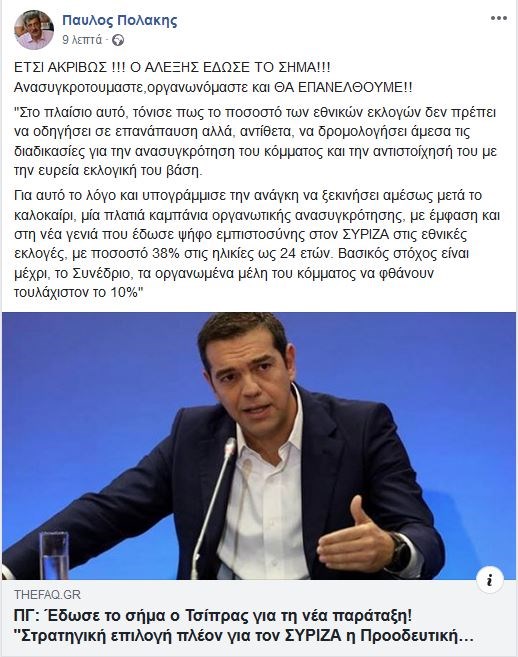 Ανάρτηση για όσα είπε ο τέως πρωθυπουργός και πρόεδρος του ΣΥΡΙΖΑ, Αλέξης Τσίπρας στην εισήγηση του στην Πολιτική Γραμματεία του κόμματος, έκανε πριν από λίγο στο προφίλ του στο Facebook o Παύλος Πολάκης.«Έτσι ακριβώς!!! Ο Αλέξης έδωσε το σήμα!!!», ανέφερε στην ανάρτηση του ο βουλευτής Χανίων του ΣΥΡΙΖΑ. «Ανασυγκροτούμαστε, οργανωνόμαστε και ΘΑ ΕΠΑΝΕΛΘΟΥΜΕ!!», συμπλήρωσε ο τέως αναπληρωτής υπουργός Υγείας.Δείτε την ανάρτηση Πολάκη: