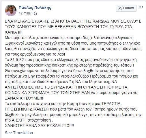 Για «τεράστια προσωπική δικαίωση» έκανε λόγο ο Παύλος Πολάκης σε μήνυμά του, σχολιάζοντας τα αποτελέσματα των εθνικών εκλογών 2019 και τη διαφαινόμενη νίκη του στα Χανιά.Μέσω Facebook, όπως άλλωστε συνηθίζει, σχολίασε το αποτέλεσμα των εθνικών εκλογών στα Χανιά, που σύμφωνα με τα μέχρι στιγμής επίσημα αποτελέσματα, έρχεται πρώτος έναντι του Γιώργου Σταθάκη, ευχαρίστησε όσους τον στήριξαν.Το μήνυμα του Παύλου Πολάκη «ΕΝΑ ΜΕΓΑΛΟ ΕΥΧΑΡΙΣΤΩ ΑΠΟ ΤΑ ΒΑΘΗ ΤΗΣ ΚΑΡΔΙΑΣ ΜΟΥ ΣΕ ΟΛΟΥΣ ΤΟΥΣ ΧΑΝΙΩΤΕΣ ΠΟΥ ΜΕ ΕΞΕΛΕΞΑΝ ΒΟΥΛΕΥΤΗ ΤΟΥ ΣΥΡΙΖΑ ΣΤΑ ΧΑΝΙΑ !!! Με τιμήσατε όλοι ,αποκορονιωτες ,κισσαμο δες, πλατανιανοι, σεληνιωτες, Σφακιανοί, Χανιώτες και εγώ από τη θέση που μας τοποθέτησε ο ελληνικός λαός θα συνεχίζω να παλεύω για τα δικιά του τόπου μας για τους αδύναμους για τους εργαζόμενους για το λαό! Το 31,5-32 που μας έδωσε ο ελληνικός λαός μας αναδεικνύει στην ηγετική δύναμη της προοδευτικής διακρατικής αριστερής παράταξης του τόπου ! Θα συνεχίσουμε να παλεύουμε για να διαφυλαχθούν οι κατακτήσεις που πετύχαμε,να μην εφαρμόσει το νεοφιλελεύθερο Πρόγραμμα του “νόμου και της τάξης και των ιδιωτικοποιήσεων «η ΝΔ του Μητσοτακη, ΝΑ ΑΝΤΙΣΤΟΙΧΗΣΟΥΜΕ ΤΟ ΣΥΡΙΖΑ ΚΑΙ ΤΗΝ ΟΡΓΑΝΩΣΗ ΤΟΥ ΜΕ ΤΑ ΚΟΙΝΩΝΙΚΑ ΣΤΡΩΜΑΤΑ ΠΟΥ ΤΟΝ ΣΤΗΡΙΞΑΝ,να ετοιμαστούμε για να να ΞΑΝΑΝΙΚΗΣΟΥΜΕ!!! Το αποτέλεσμα στα Χανιά και στην Κρήτη ήταν και μια ΤΕΡΑΣΤΙΑ ΠΡΟΣΩΠΙΚΗ ΔΙΚΑΙΩΣΗ που μετά τον Αλέξη τον Τσίπρα ήμουν αυτός που δέχθηκε το μεγαλύτερο προσωπικό μπούλινγκ ,την περισσότερη λάσπη ,την πιο ΑΙΣΧΡΗ στοχοποίηση . ΧΕΝΙΩΤΕΣ ΞΑΝΑ ΣΑΣ ΕΥΧΑΡΙΣΤΩ!!!!».Δείτε την ανάρτηση του Παύλου Πολάκη: