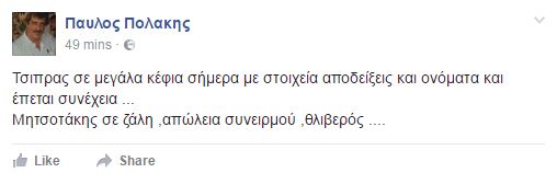 Σε ανάρτηση στον λογαριασμό του στο Facebook ο αναπληρωτής υπουργός Υγείας Παύλος Πολάκης σχολίασε τις ομιλίες του Πρωθυπουργού Αλέξη Τσίπρα και του προέδρου της ΝΔ, Κυριάκου Μητσοτάκη στη Βουλή, στην προ ημερησίας διατάξεως συζήτηση για τη διαφθορά και τη διαπλοκή.