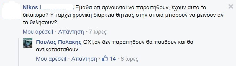 Για την αρνητική απάντηση του κ. Γιαννόπουλου ρωτήθηκε ο κ. Πολάκης από κάποιον διαδικτυακό του φίλο στο Facebook. “Έμαθα ότι αρνούνται να παραιτηθούν, έχουν αυτό το δικαίωμα;” τον ρώτησε.  “Αν δεν παραιτηθούν θα παυθούν και θα αντικατασταθούν” απάντησε ο αναπληρωτής υπουργός Υγεία.