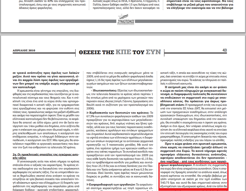 “Ο επιθεωρητής Κλουζό της ΝΔ, κ.Μιχελάκης, ανακάλυψε πάλι τη δραχμή, βρίσκοντας ένα κείμενο του προσυνεδριακού διαλόγου στο τελευταίο συνέδριο του ΣΥΝΑΣΠΙΣΜΟΥ, το οποίο ουδεμία σχέση έχει με τις θέσεις και τις προτάσεις του ΣΥΝ και του ΣΥΡΙΖΑ. Κατανοούμε το άγχος και την αγωνία της ΝΔ στο να κρύψει αφενός ότι το πραγματικό της πρόγραμμα είναι το δεύτερο μνημόνιο, δηλαδή οι περαιτέρω απολύσεις και περικοπές σε μισθούς και συντάξεις, και αφετέρου ότι ένα μέρος του πολιτικού της προσωπικού είναι βουτηγμένο στα σκάνδαλα και τη διαπλοκή. Φαίνεται όμως ότι για τη ΝΔ του κ.Σαμαρά δεν υπάρχει κανένα όριο στην αυτογελοιοποίηση”, αναφέρει το σχόλιο του ΣΥΡΙΖΑ.