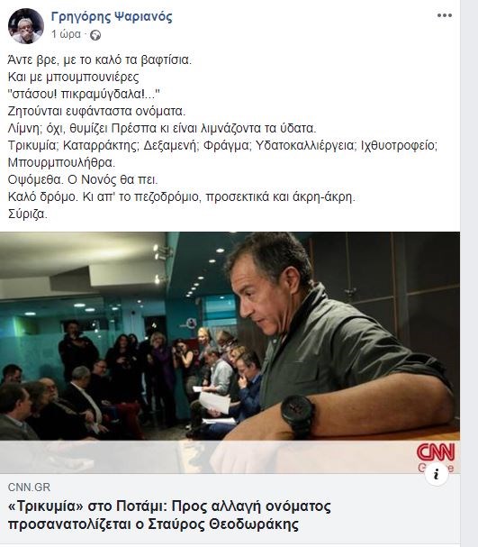 Δημοσιεύματα που αναφέρουν ότι ο Σταύρος Θεοδωράκης σκέφτεται την αλλαγή ονόματος στο Ποτάμι, σχολιάζει με αιχμηρό τρόπο ο Γρηγόρης Ψαριανός.