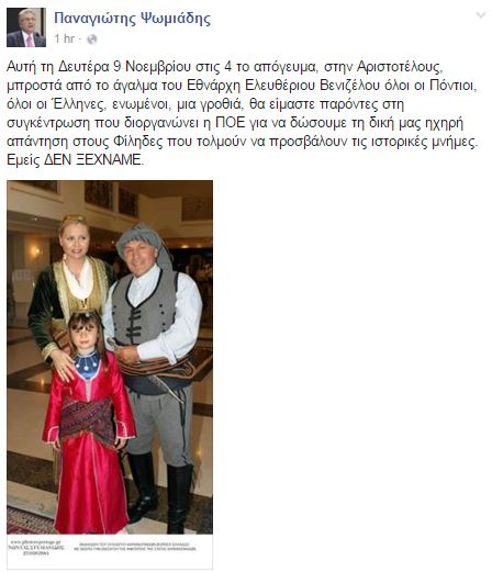 «Αυτή τη Δευτέρα 9 Νοεμβρίου στις 4 το απόγευμα, στην Αριστοτέλους, μπροστά από το άγαλμα του Εθνάρχη Ελευθέριου Βενιζέλου όλοι οι Πόντιοι, όλοι οι Έλληνες, ενωμένοι, μια γροθιά, θα είμαστε παρόντες στη συγκέντρωση που διοργανώνει η ΠΟΕ για να δώσουμε τη δική μας ηχηρή απάντηση στους Φίληδες που τολμούν να προσβάλουν τις ιστορικές μνήμες. Εμείς δεν ξεχνάμε.»