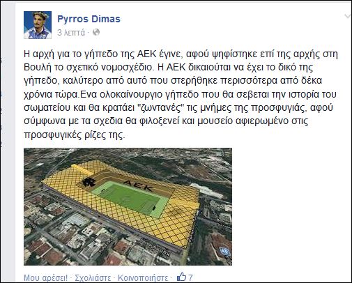 «Η αρχή για το γήπεδο της ΑΕΚ έγινε, αφού ψηφίστηκε επί της αρχής στη Βουλή το σχετικό νομοσχέδιο. Η ΑΕΚ δικαιούται να έχει το δικό της γήπεδο, καλύτερο από αυτό που στερήθηκε περισσότερα από δέκα χρόνια τώρα. Ένα ολοκαίνουργιο γήπεδο που θα σέβεται την ιστορία του σωματείου και θα κρατάει “ζωντανές” τις μνήμες της προσφυγιάς, αφού σύμφωνα με τα σχέδια θα φιλοξενεί και μουσείο αφιερωμένο στις προσφυγικές ρίζες της», ήταν το σχόλιο του Πύρρου Δήμα.