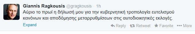 “Αύριο το πρωί η δήλωσή μου για την κυβερνητική τροπολογία ευτελισμού κανόνων και αποδόμησης μεταρρυθμίσεων στις αυτοδιοικητικές εκλογές”, έγραψε ο κ. Ραγκούσης.