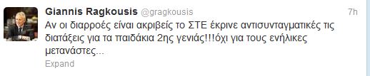 Τη γνωμοδότηση της Ολομέλειας του Συμβουλίου της Επικρατείας που έκρινε αντισυνταγματικές τις διατάξεις του Νόμου Ραγκούση για την Ιθαγένεια, σχολίασε μέσω Twitter ο πρώην υπουργός του ΠΑΣΟΚ.