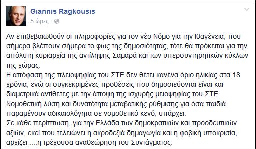 Το σχέδιο νόμου του υπουργείου Εσωτερικών, το οποίο προβλέπει την απόδοση ελληνικής ιθαγένειας στα παιδιά νόμιμων μεταναστών, μετά την ενηλικίωσή τους, σχολίασε μέσω του προσωπικού του λογαριασμού στο facebook, ο Γιάννης Ραγκούσης, επισημαίνοντας ότι η απόφαση της πλειοψηφίας του ΣτΕ, δεν θέτει κανένα όριο ηλικίας στα 18 χρόνια. Αναλυτικά όσα έγραψε ο Γιάννης Ραγκούσης: