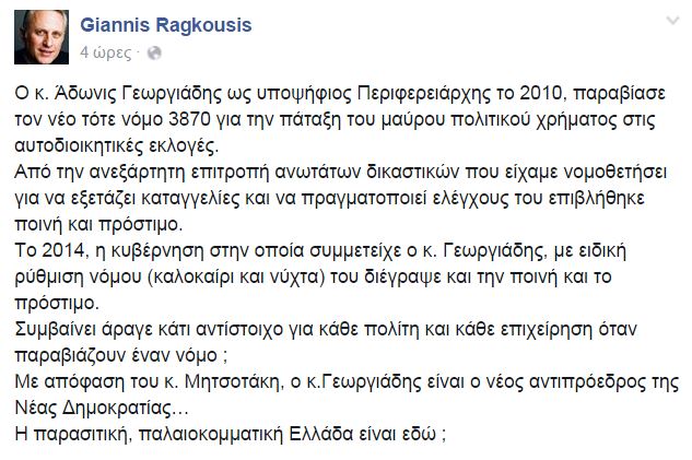 Για παραβίαση της νομοθεσίας όταν ήταν υποψήφιος Περιφερειάρχης το 2010 καταγγέλλει τον Άδωνι Γεωργιάδη ο Γιάννης Ραγκούσης.
