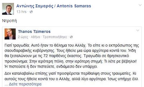 Την ανάρτηση του Θάνου Τζήμερου στο Facebook για την τραγωδία στην Μέκκα, η οποία προκάλεσε έντονες αντιδράσεις, σχολίασε ο πρώην πρωθυπουργός, Αντώνης Σαμαρας μέσω του λογαριασμού του στο Facebook.