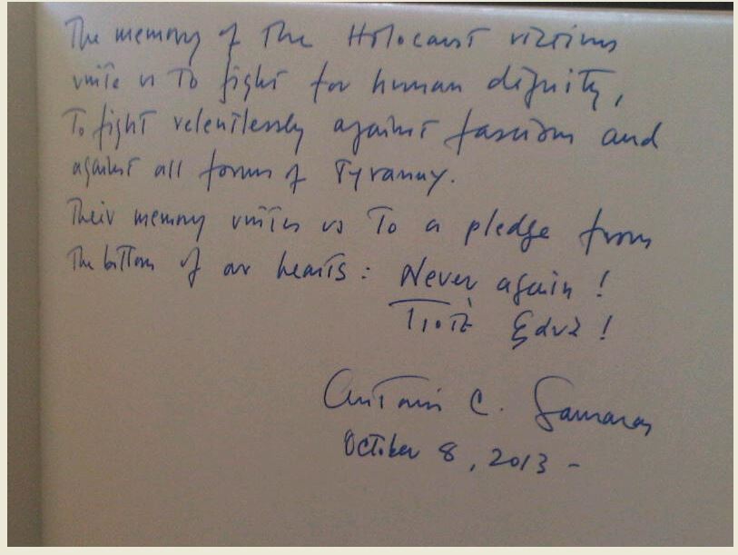 Κατέθεσε στεφάνι, μίλησε με τον πρόεδρο των επιζώντων του ολοκαυτώματος και υπέγραψε στο βιβλίο προσωπικοτήτων, κλείνοντας το μήνυμά του “ποτέ ξανά”.