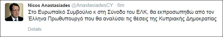 «Στο Ευρωπαϊκό Συμβούλιο και στη Σύνοδο του ΕΛΚ, θα εκπροσωπηθώ από τον Έλληνα Πρωθυπουργό που θα αναλύσει τις θέσεις της Κυπριακής Δημοκρατίας», ανέφερε χαρακτηριστικά η τελευταία ενημέρωση από το Twitter του Κύπριου Προέδρου.