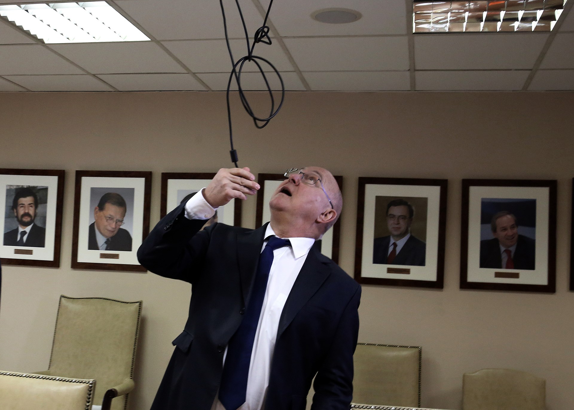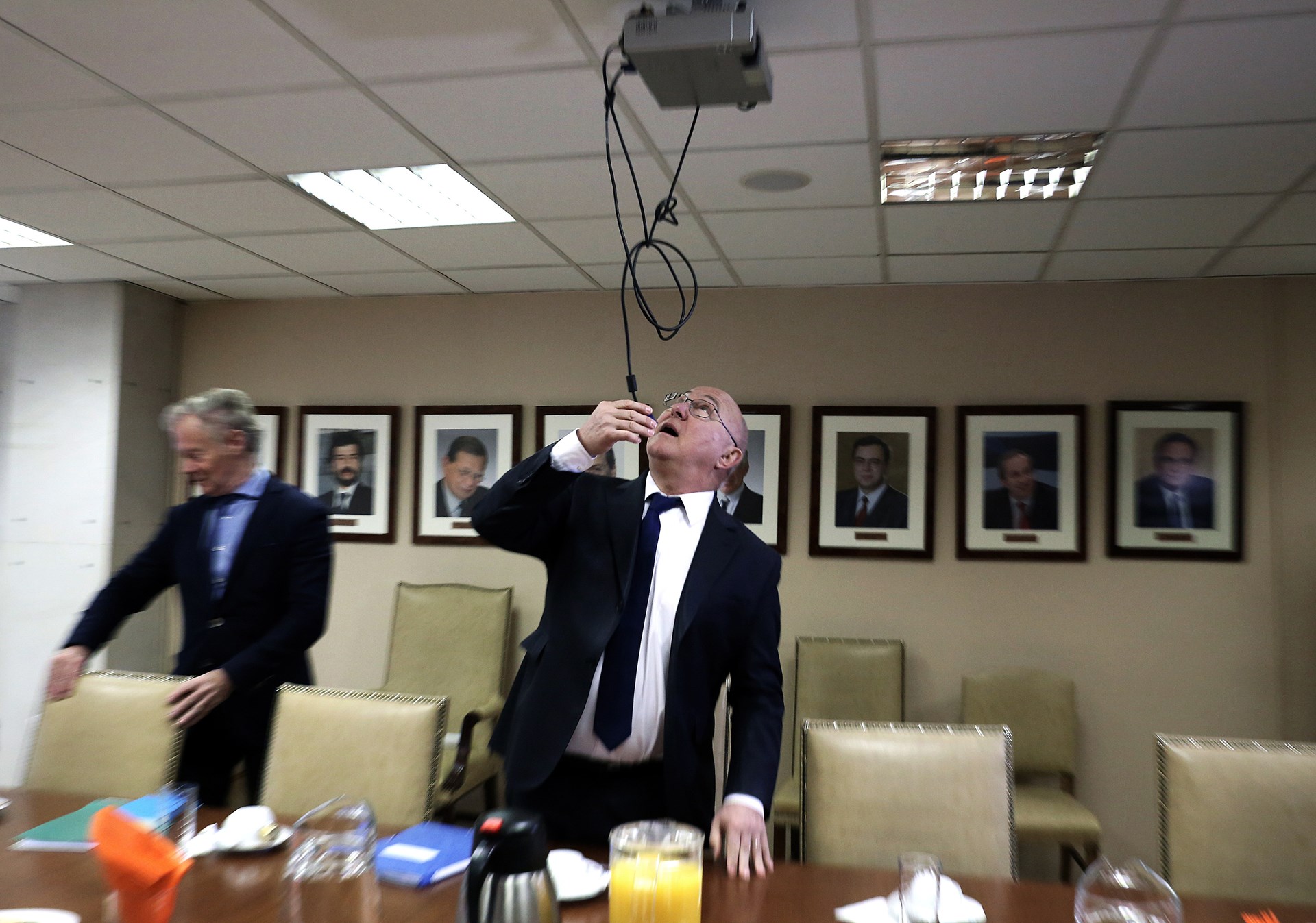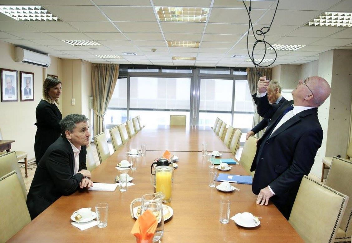 Με τον Γάλλο ομόλογό του συναντήθηκε το πρωί ο υπουργός Οικονομικών Ευκλείδης Τσακαλώτος. Ωστόσο, τον γύρο του διαδικτύου κάνουν φωτογραφίες στις οποίες φαίνεται ο Μισέλ Σαπέν να προσπαθεί να μαζέψει… τα καλώδια του προτζέκτορα που κρέμονταν από το ταβάνι, ακριβώς πάνω από το σημείο όπου θα καθόταν.Σε μία από αυτές τις φωτογραφίες, εντύπωση προκαλεί η στάση του Ευκλείδη Τσακαλώτου, ο οποίος παρακολουθεί τον Γάλλο ομόλογό του… απαθής. Η συνάντηση πραγματοποιήθηκε στο πλαίσιο της επίσκεψης του Γάλλου πρωθυπουργού Μπερνάρ Καζνέβ στην Αθήνα.