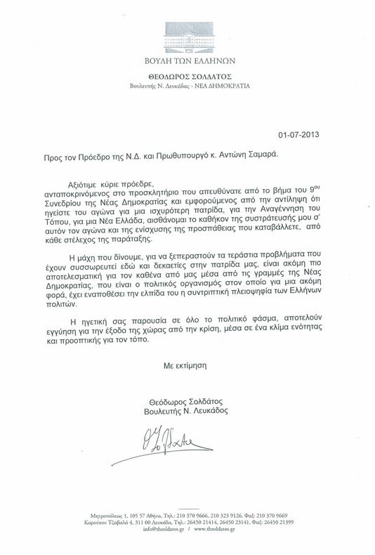 Στο προσκλητήριο συστράτευσης που απηύθυνε ο Αντώνης Σαμαράς ανταποκρίθηκε και ο ανεξάρτητος Βουλευτής Λευκάδας Θεόδωρος Σολδάτος , όπως προκύπτει από δήλωσή που απέστειλε στον πρόεδρο της ΝΔ.