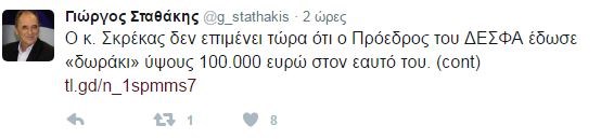 Νέα απάντηση για το θέμα των αποδοχών του προέδρου του ΔΕΣΦΑ έδωσε απόψε ο υπουργός Περιβάλλοντος και Ενέργειας Γιώργος Σταθάκης με ανάρτηση σχολίου στο Twitter, προαναγγέλλοντας περαιτέρω αποκαλύψεις στη Βουλή.”Ο κ. Σκρέκας δεν επιμένει τώρα ότι ο πρόεδρος του ΔΕΣΦΑ έδωσε «δωράκι» ύψους 100.000 ευρώ στον εαυτό του” αναφέρει ο υπουργός και προσθέτει:”Μετά από αυτό το «αυτογκόλ» του, ακολουθεί και β’ ημίχρονο, με ατράνταχτα στοιχεία. Την άλλη εβδομάδα, στη Βουλή…”.Δείτε το tweet: