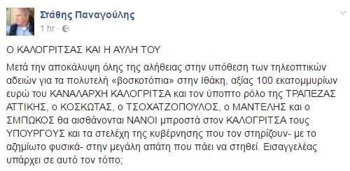 Με μία ανάρτησή του στον προσωπικό του λογαριασμό στο facebook, ο ανεξάρτητος βουλευτής, Στάθης Παναγούλης, επιτίθεται στην κυβέρνηση και σχολάζει τα «πολυτελή βοσκοτόπια» του Καλογρίτσα.