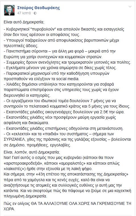 Διαβάστε την ανάρτηση του Σταύρου Θεοδωράκη στο Facebook: