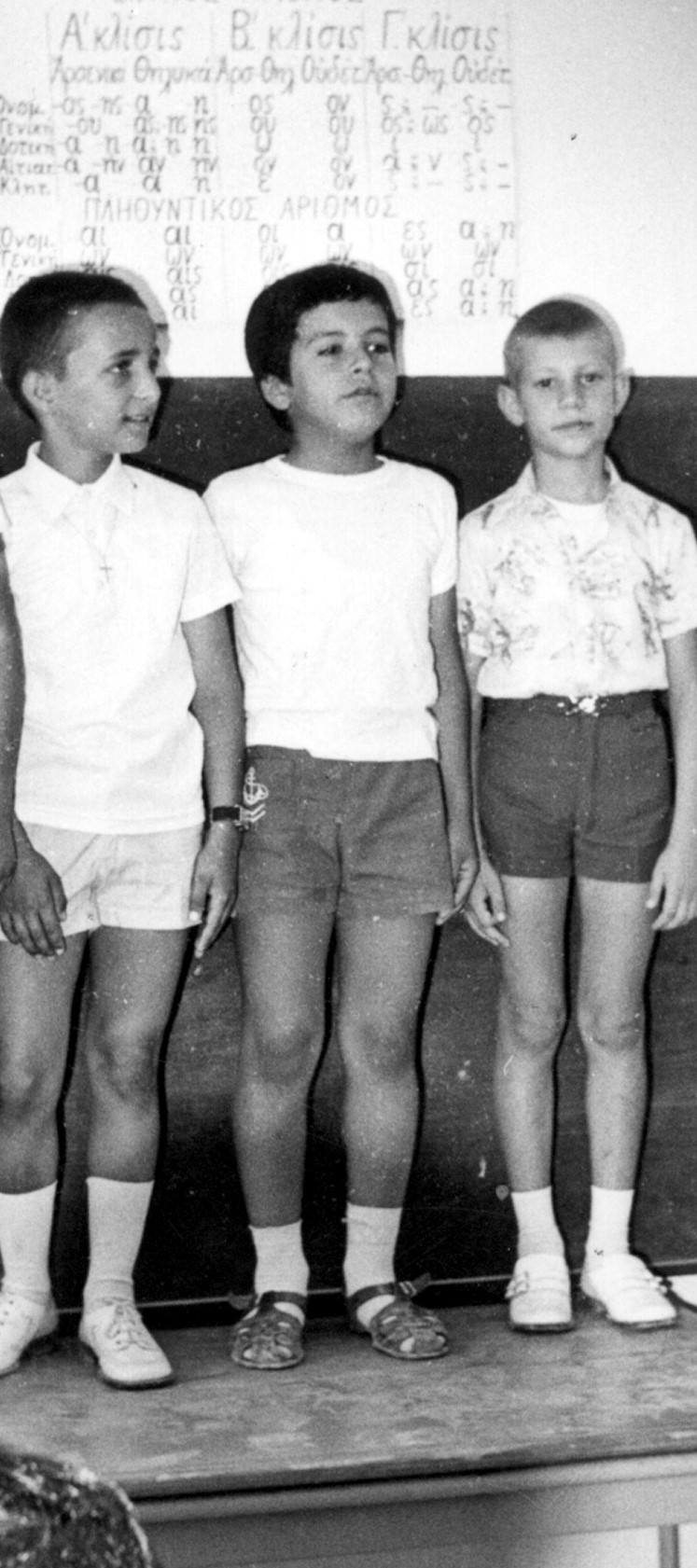 “Η αλήθεια είναι ότι δεν ξέρω πότε είναι τραβηγμένη η φωτογραφία (εγώ στη μέση με τα πέδιλα – 2ο δημοτικό σχολείο Αγίας Βαρβάρας). Θυμάμαι όμως το θρανίο που έτρεμε κάθε φορά που φούσκωνε το στήθος μας για να βγει η φωνή της απαγγελίας.