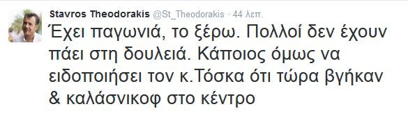 «Έχει παγωνιά, το ξέρω. Πολλοί δεν έχουν πάει στη δουλειά. Κάποιος όμως να ειδοποιήσει τον κ. Τόσκα ότι τώρα βγήκαν και καλάσνικοφ στο κέντρο», έγραψε στο Twitter ο επικεφαλής του Ποταμιού, Σταύρος Θεοδωράκης, για την επίθεση με καλάσνικοφ στα γραφεία του ΠΑΣΟΚ.