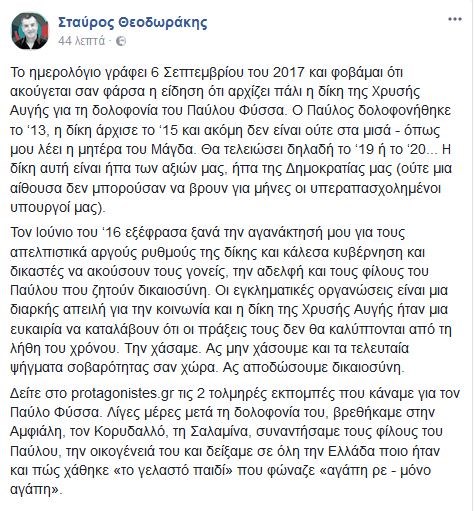 «Το ημερολόγιο γράφει 6 Σεπτεμβρίου του 2017 και φοβάμαι ότι ακούγεται σαν φάρσα η είδηση ότι αρχίζει πάλι η δίκη της Χρυσής Αυγής για τη δολοφονία του Παύλου Φύσσα. Ο Παύλος δολοφονήθηκε το ‘13, η δίκη άρχισε το ‘15 και ακόμη δεν είναι ούτε στα μισά – όπως μου λέει η μητέρα του, Μάγδα. Θα τελειώσει δηλαδή το ‘19 ή το ‘20… Η δίκη αυτή είναι ήττα των αξιών μας, ήττα της Δημοκρατίας μας (ούτε μια αίθουσα δεν μπορούσαν να βρουν για μήνες οι υπεραπασχολημένοι υπουργοί μας)», αναφέρει ο επικεφαλής του Ποταμιού.