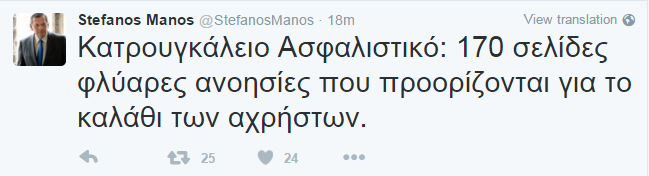 Επίθεση στον υπουργό Εργασίας, Γιώργο Κατρούγκαλο, εξαπολύει ο Στέφανος Μάνος, σε ανάρτηση στον προσωπικό του λογαριασμό στο Twitter, με αφορμή το ασφαλιστικό, κάνοντας λόγο για φλύαρες ανοησίες που προορίζονται για το καλάθι των αχρήστων.