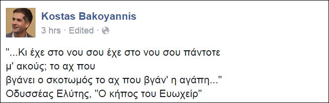 Έναν στίχο του Οδυσσέα Ελύτη ανέβασε στον προσωπικό του λογαριασμό στο Facebook ο Κώστας Μπακογιάννης για να τιμήσει την μνήμη του πατέρα του που σαν σήμερα πριν από 26 χρόνια έπεσε νεκρός από τα πυρά των τρομοκρατών.