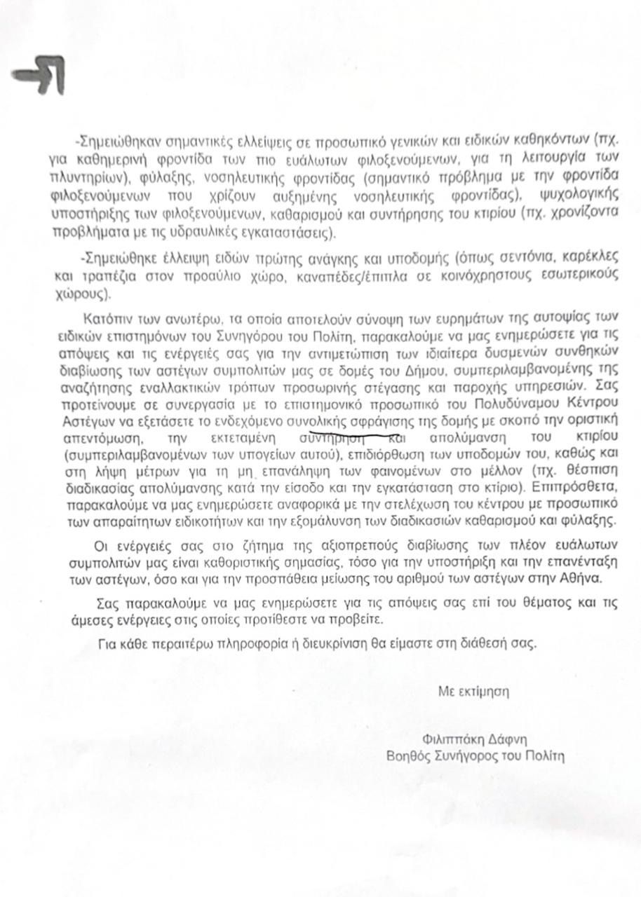 «Παρακαλούμε να μας ενημερώσετε για τις απόψεις και τις ενέργειές σας για την αντιμετώπιση των ιδιαίτερα δυσμενών συνθηκών διαβίωσης των άστεγων συμπολιτών μας στις δομές του Δήμου, συμπεριλαμβανομένης της αναζήτησης εναλλακτικών τρόπων προσωρινής στέγασης και παροχής υπηρεσιών. Σας προτείνουμε σε συνεργασία με το επιστημονικό προσωπικό του Πολυδύναμου Κέντρου Αστέγων να εξετάσετε το ενδεχόμενο ΣΥΝΟΛΙΚΗΣ ΣΦΡΑΓΙΣΗΣ ΤΗΣ ΔΟΜΗΣ με σκοπό την οριστική απεντόμωση, την εκτεταμένη συντήρηση και απολύμανση του κτιρίου, επιδιόρθωση των υποδομών του καθώς και στη λήψη μέτρων για τη μη επανάληψη των φαινομένων στο μέλλον».