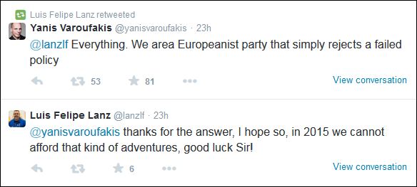 «Τα πάντα. Είμαστε ένα φιλοευρωπαϊκό κόμμα που απορρίπτει απλά μια αποτυχημένη πολιτική», ήταν η απάντηση του κ. Βαρουφάκη με τον κ. Λανθ να εύχεται «καλή τύχη» στην Ελλάδα.