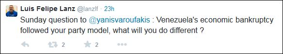 Την απόσταση που χωρίζει το οικονομικό μοντέλο της Ελλάδας από εκείνο της Βενεζουέλας επισημαίνει ο Γιάνης Βαρουφάκης σε απάντησή του στο δημοσιογράφο, Λουίς Φελίπε Λανθ, μέσω Twitter.
