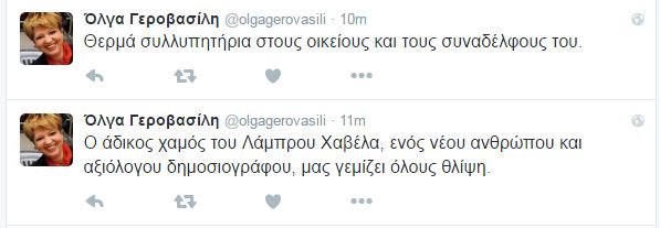 «Ο άδικος χαμός του Λάμπρου Χαβέλα, ενός νέου ανθρώπου και αξιόλογου δημοσιογράφου, μας γεμίζει όλους θλίψη», ανέφερε η κυβερνητική εκπρόσωπος Όλγα Γεροβασίλη σε ανάρτησή της στο Twitter και εκφράζει τα θερμά συλλυπητήριά της στους οικείους και τους συναδέλφους του.