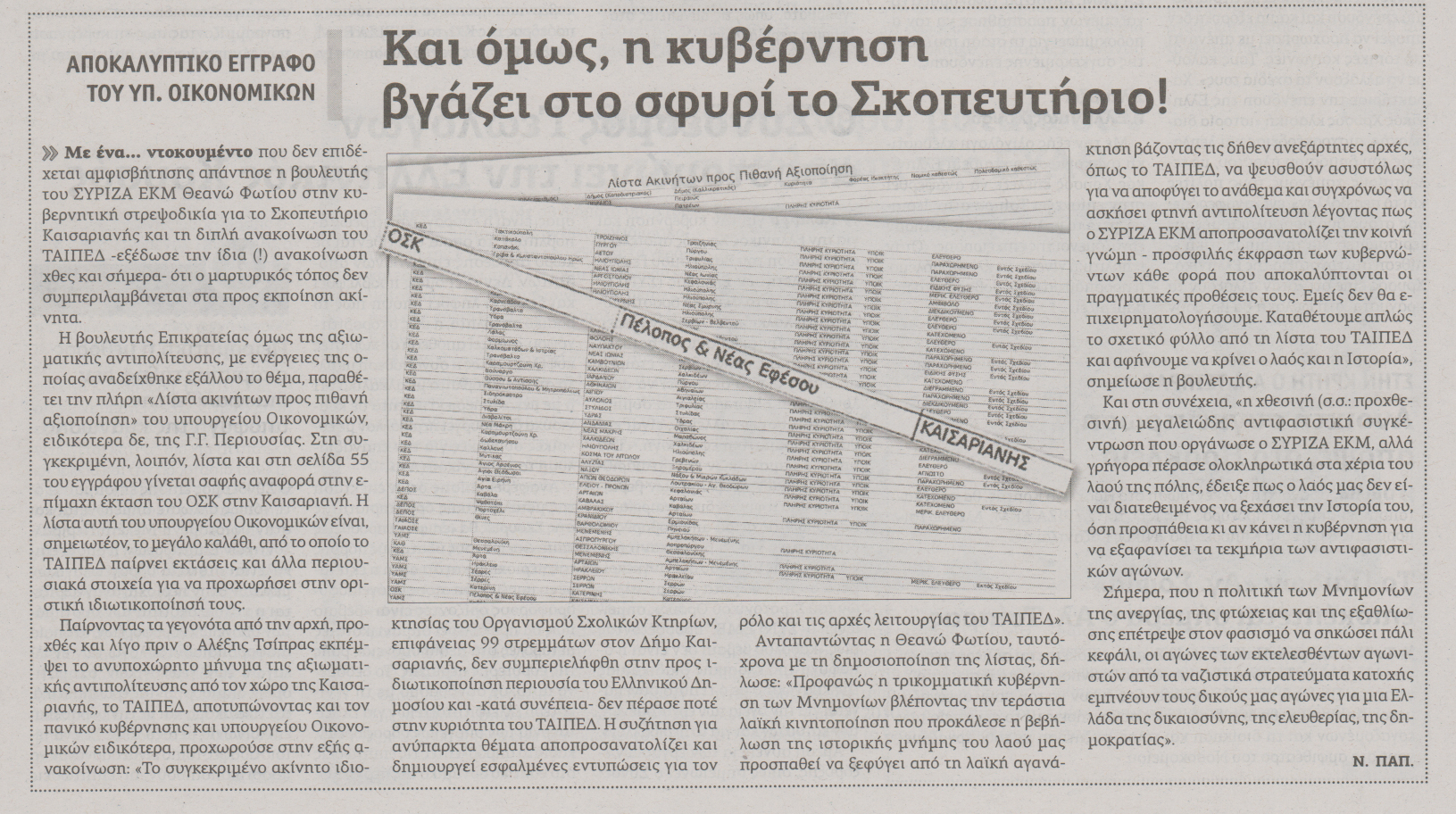 «Και όμως, η κυβέρνηση βγάζει στο σφυρί το Σκοπευτήριο» καταγγέλλει ο ΣΥΡΙΖΑ, με έγγραφο της βουλευτού Θεανώς Φωτίου, για το μείζον θέμα με το ιστορικό σκοπευτήριο Καισαριανής.