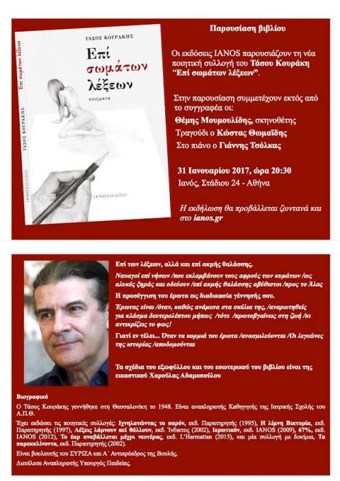 Η νέα ποιητική συλλογή του Τάσου Κουράκη έχει τίτλο «Επί σωμάτων λέξεων» και, όπως οι προηγούμενες, υμνεί τον έρωτα και το γυναικείο σώμα με ιδιαίτερη -ίσως και προκλητική για ορισμένους- γλαφυρότητα.