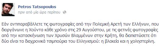 Τους “Ολυμπιακούς Άθλους” της Χρυσής Αυγής σε παραλία κατά τη διάρκεια της “Εθνικιστικής Κατασκήνωσης” στην Κρήτη, σχολίασε ο βουλευτής του ΣΥΡΙΖΑ Πέτρος Τατσόπουλος μέσω facebook.