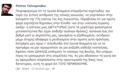 Με αφορμή το δημοσίευμα της Real News για την Χρυσή Αυγή και το φεστιβάλ μίσους που θα πραγματοποιηθεί στις 4 Αυγούστου στην Καλαμάτα, ο βουλευτής του ΣΥΡΙΖΑ Πέτρος Τατσόπουλος απευθυνόμενος στα μέλη του κόμματος τα προτρέπει να προετοιμάσουν τη δική τους δικατορία, τονίζοντας ωστόσο, ότι “Αυτή τη φορά, θα τους περιμένουμε”.