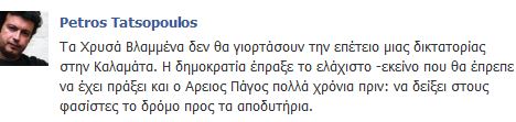 Πριν από λίγο ο Πέτρος Τατσόπουλος σχολίασε στο Facebook την είδηση της ματαίωσης του φεστιβάλ της Χρυσής Αυγής στην Καλαμάτα.