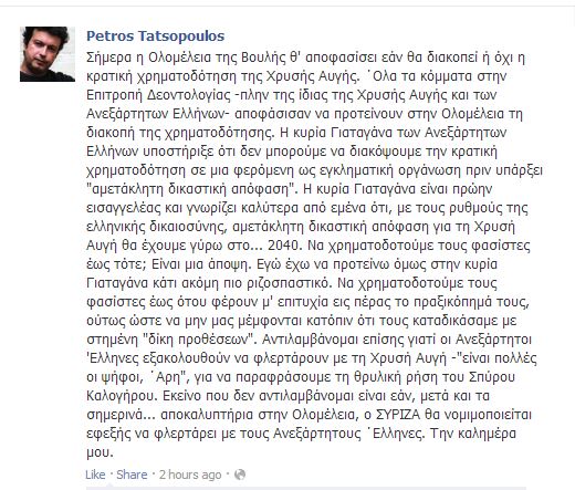 Οξύτατη κριτική στους Ανεξάρτητους Έλληνες ασκεί ο Πέτρος Τατσόπουλος για την στάση που θα τηρήσει μερίδα στελεχών τους στην ψηφοφορία για την διακοπή χρηματοδότησης της Χρυσής Αυγής. Ο κ.Τατσόπουλος με ανάρτηση στον προσωπικό του λογαριασμό στο Facebook στρέφει τα πυρά του προς την Χρυσούλα-Μαρία Γιαταγάνα για την αντίθεση της στην διακοπή χρηματοδότησης της Χρυσής Αυγής χωρίς την έκδοση αμετάκλητης δικαστική απόφασης.