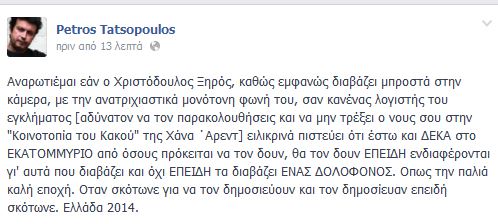 Μέσω Facebook ο Πέτρος Τατσόπουλος σχολίασε το μήνυμα του Χριστόδουλου Ξηρού.