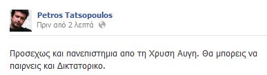 Πριν από λίγο ο Πέτρος Τατσόπουλος σχολίασε στην προσωπική του σελίδα στο Facebook την πρόθεση της Χρυσής Αυγής να ανοίξει βρεφονηπιακούς σταθμούς μόνο για τα παιδιά Ελλήνων.