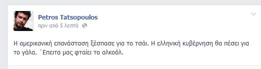 «Η αμερικανική επανάσταση ξέσπασε για το τσάι. Η ελληνική κυβέρνηση θα πέσει για το γάλα. Έπειτα μας φταίει το αλκοόλ», έγραψε ο ανεξάρτητος βουλευτής.