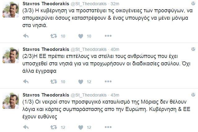 Στο τραγικό περιστατικό στο hot spot της Μόριας αναφέρθηκε με αναρτήσεις του στο twitter ο επικεφαλής του Ποταμιού Σταύρος Θεοδωράκης.