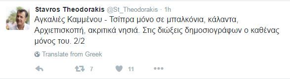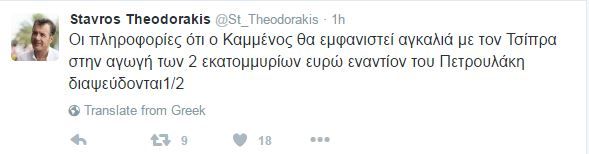 «Οι πληροφορίες ότι ο Καμμένος θα εμφανιστεί αγκαλιά με τον Τσίπρα στην αγωγή των 2 εκατομμυρίων ευρώ εναντίον του Πετρουλάκη διαψεύδονται. Αγκαλιές Καμμένου – Τσίπρα μόνο σε μπαλκόνια, κάλαντα, Αρχιεπισκοπή, ακριτικά νησιά. Στις διώξεις δημοσιογράφων ο καθένας μόνος του» έγραψε ο κ. Θεοδωράκης.