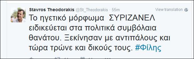 «Το ηγετικό μόρφωμα ΣΥΡΙΖΑΝΕΛ ειδικεύεται στα πολιτικά συμβόλαια θανάτου. Ξεκίνησαν με αντιπάλους και τώρα τρώνε και δικούς τους. #Φίλης».