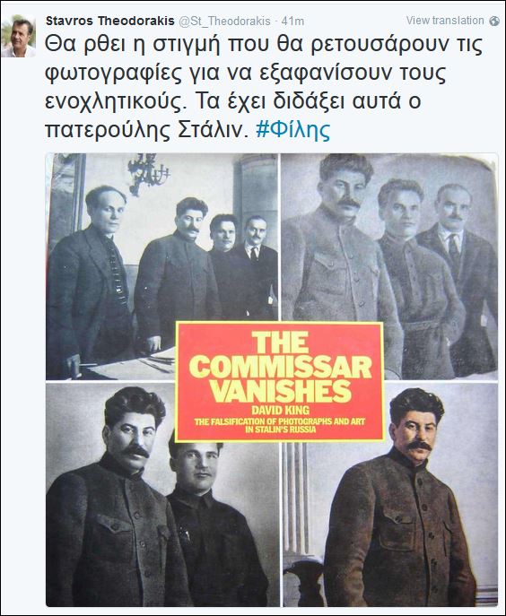 «Θα έρθει η στιγμή που θα ρετουσάρουν τις φωτογραφίες για να εξαφανίσουν τους ενοχλητικούς. Τα έχει διδάξει αυτά ο πατερούλης Στάλιν. #Φίλης», έγραψε ο επικεφαλής του Ποταμιού και πρόσθεσε:
