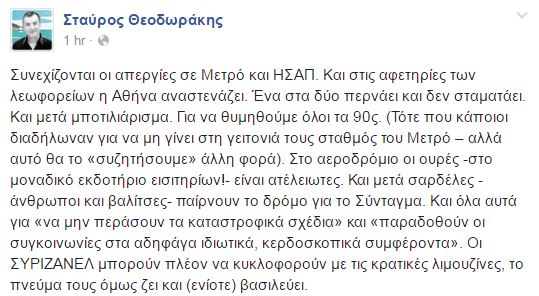 Mε ανάρτησή του στο Facebook o επικεφαλής του Ποταμιού Σταύρος Θεοδωράκης σχολιάζει τις απεργίες στα μέσα μεταφοράς ενώ εξαπολύει επίθεση στην κυβέρνηση σημειώνοντας: «Οι ΣΥΡΙΖΑΝΕΛ μπορούν πλέον να κυκλοφορούν με τις κρατικές λιμουζίνες, το πνεύμα τους όμως ζει και (ενίοτε) βασιλεύει».