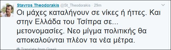 Με ένα καυστικό σχόλιο στο Twitter αναφέρθηκε ο Σταύρος Θεοδωράκης στο αποτέλεσμα του Eurogroup”Οι μάχες καταλήγουν σε νίκες ή ήττες. Και στην Ελλάδα του Τσίπρα σε… μετονομασίες. Νέο μίγμα πολιτικής θα αποκαλούνται πλέον τα νέα μέτρα”, έγραψε ο επικεφαλής του Ποταμιού.