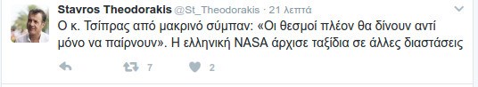 Επίθεση στον Πρωθυπουργό, Αλέξη Τσίπρα για τη σημερινή του ομιλία στη Βουλή εξαπέλυσε με ανάρτησή του στο λογαριασμό του στο Twitter ο επικεφαλής του Ποταμιού, Σταύρος Θεοδωράκης.«Ο κ. Τσίπρας από μακρινό σύμπαν: Οι θεσμοί πλέον θα δίνουν αντί μόνο να παίρνουν’’», έγραψε χαρακτηριστικά ο κ. Θεοδωράκης και εν συνεχεία θυμήθηκε την ελληνική ΝASA.«Η ελληνική NASA άρχισε ταξίδια σε άλλες διαστάσεις», ανέφερε ο επικεφαλής του Ποταμιού. Δείτε την ανάρτηση: